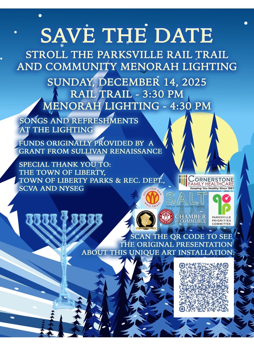 Parksville Rail Trail Walk and Community Menorah Lighting – Parksville Rail Trail Entrance on Main St. – 12/14/25